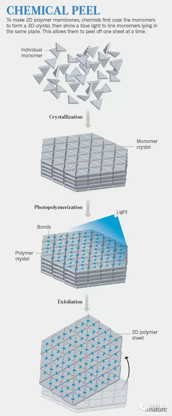 他的方法是利用精心设计的单体形成晶体。在相同的平面内通过一束蓝光引发单体之间的化学反应,并由层叠的聚合物层形成新的结晶。这样就能使得2D 聚合物只有一层分子的厚度。