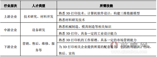 通过检索相关企业的招聘信息,并结合相关专业知识,我国3D打印行业企业所需人才按企业所处的行业层次可以分为三种类型:一是上游技术和材料研发企业所需的3D打印技术研究、材料开发人才;二是中游设备生产商所需的3D打印机生产研发人才;三是下游服务商所需的3D打印机营销、售后服务以及3D打印服务等方面的技术应用人才。这三类人才所需掌握的技术技能,如表2所示,3D打印行业的人才需求类型及所需的技术技能。