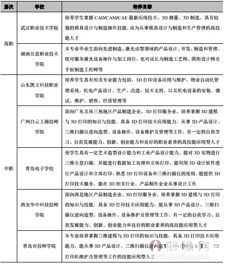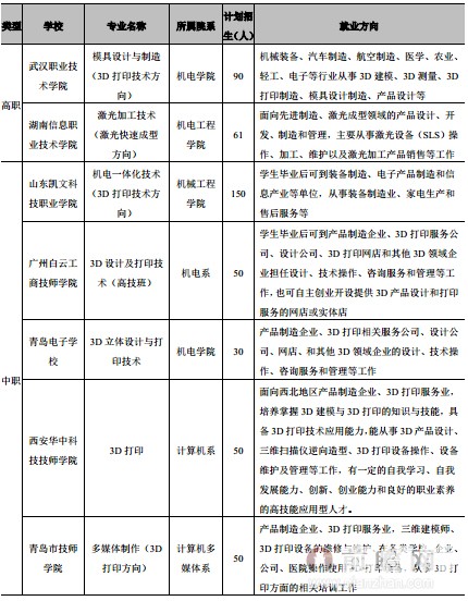 随着3D打印行业的快速发展,3D打印相关专业已成为市场热门专业,并且种类繁多。目前国内中职和高职院校都已开3D打印类相关专业。根据最新修订的《普通高等学校高等职业教育(专科)专业目录(2015年)》,部分专业设有“3D打印”、“增材制造技术”方向,如机械制造与自动化专业(增材制造技术方向)、航空材料精密成型技术专业(航空产品3D打印)等;而根据2010年修订的《中等职业学校专业目录》中,并未显示相关命名的专业。不过,随着3D打印专业人才的需求越来越多,部分中职院校已经设置了相关专业。