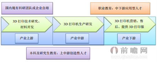 3D打印的技术特点决定了3D打印行业对综合性人才的特殊性要求。如3D打印的技术研究和材料开发所需的是主要来自国内的技术实验室及其团队和高校培养的硕、博士研究生等的高层次专业技术人才;3D打印设备的研发生产所需的是更多涉及机械加工制造领域的人才;3D打印应用服务则需要具备一定的工业设计、计算机软件编程等能力的技术应用人才,这些人才主要来自普通高等院校和职业院校,如图2所示。
